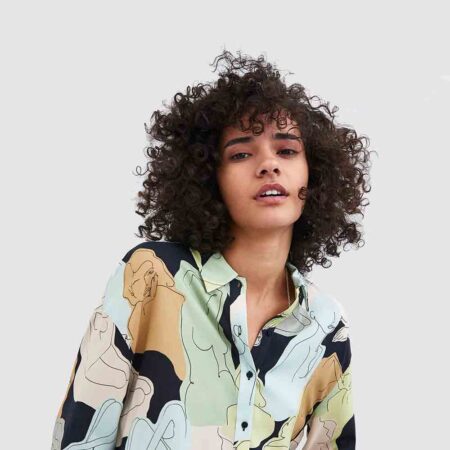 Short V-neck shirt with lapel collar and long sleeves with pleated cuffs.